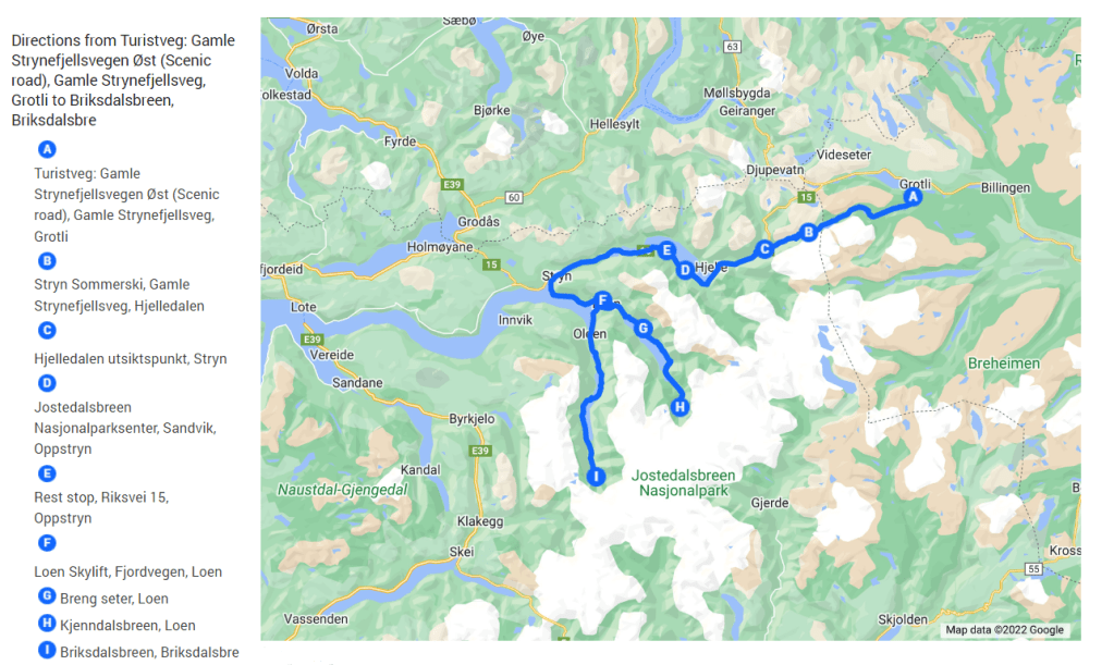 While heading towards Stryn from Jostedalsbreen National Park Center don’t forget to take a small break at the rest stop (destination E on the map). From here one can really appreciate the fjord along oppstrynvatnet. Also, this place has picture-perfect views for a photoshoot.